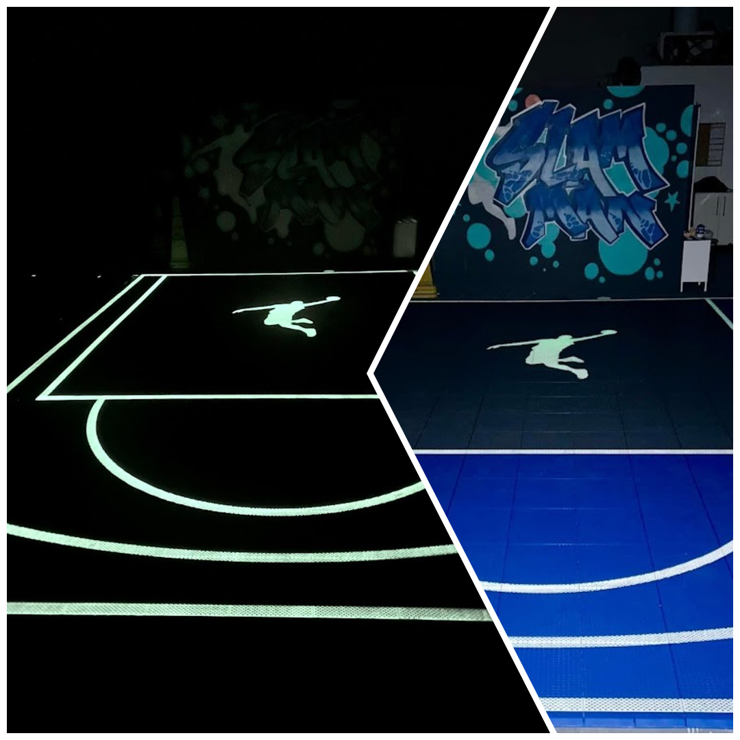 a basketball key with 3-point line, or a multi-sports court that brings it all together, glow-in-the-dark line marking can be applied. The beauty of this feature is its flexibility. It works for any size or shape, and because it bonds directly to our modular tiles, installation is quick and clean.