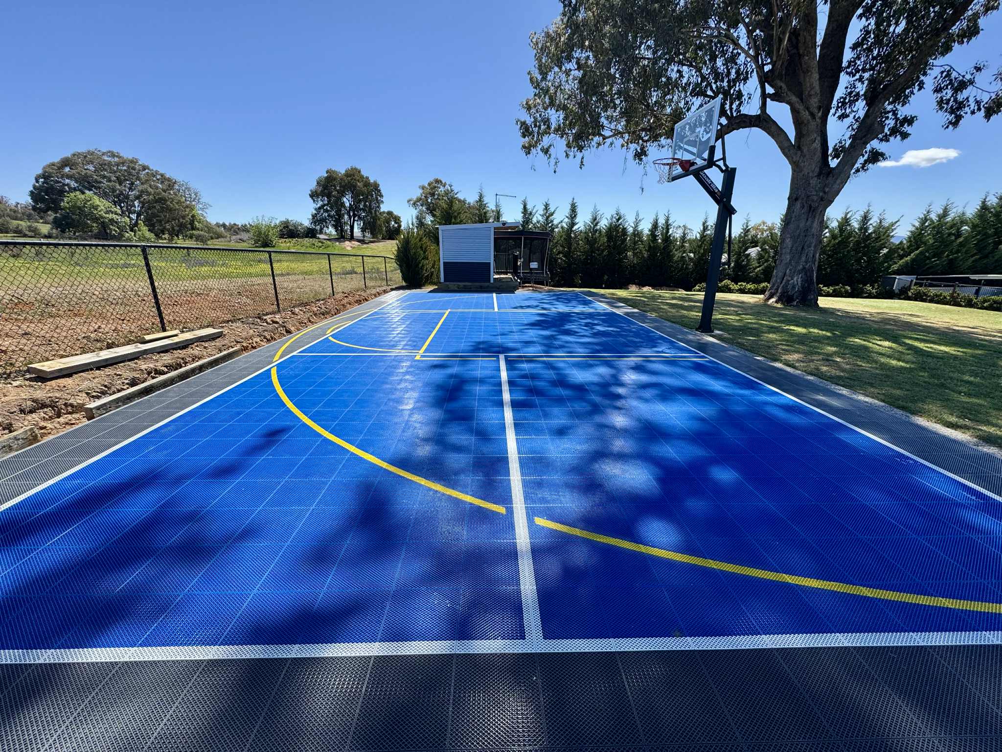This backyard transformation features a vibrant blue play area, surrounded by a dark grey outer court, with a yellow lined basketball key and three point line. It’s the ideal combination of colour, performance and practicality.