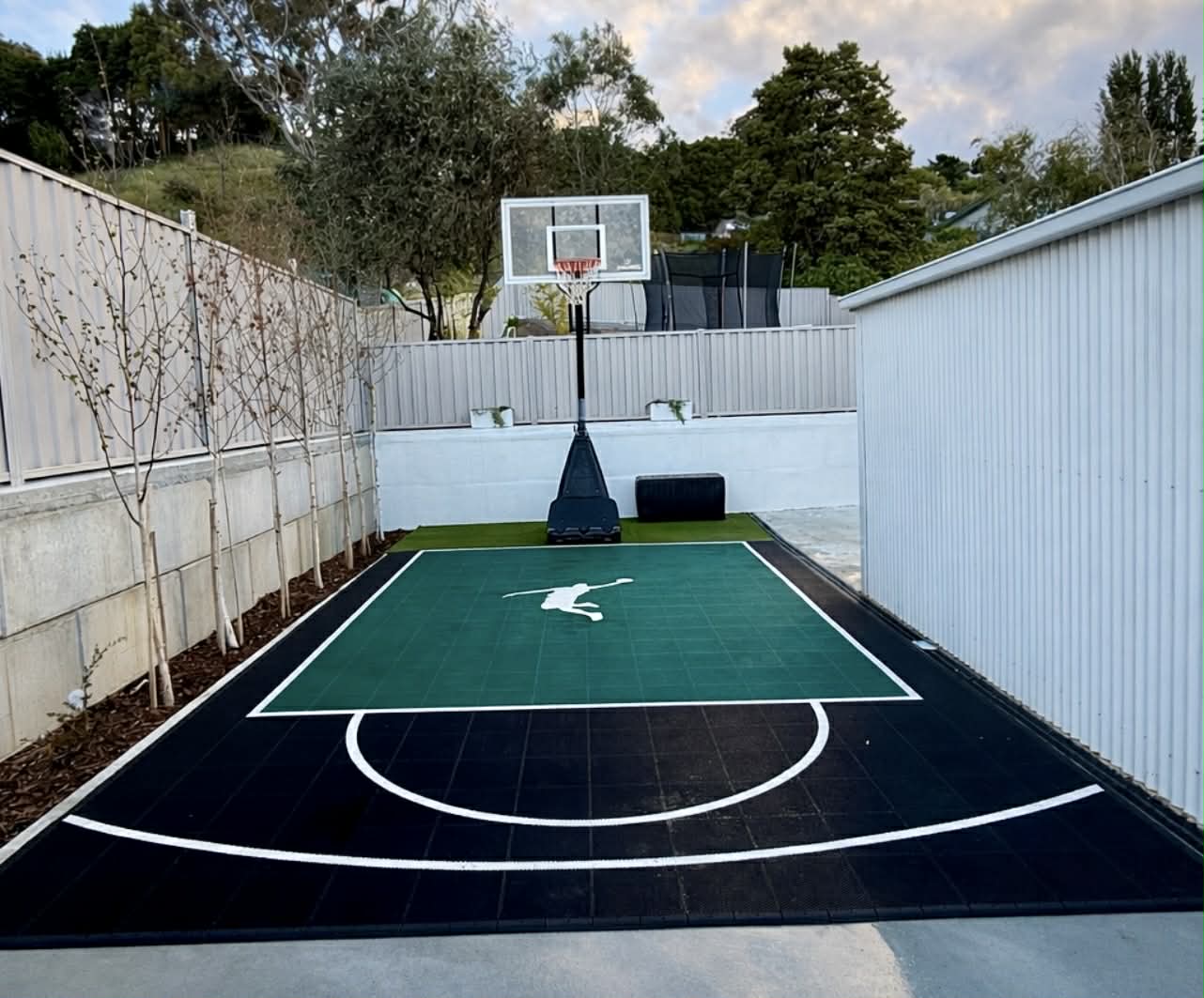 Featuring a striking dark green key with a bold black outer, this compact backyard basketball court makes a serious visual statement while maximising play space. The court is finished with our exclusive glow in the dark line markings and the iconic Slam Man logo, delivering crisp definition during the day and standout visibility at night.