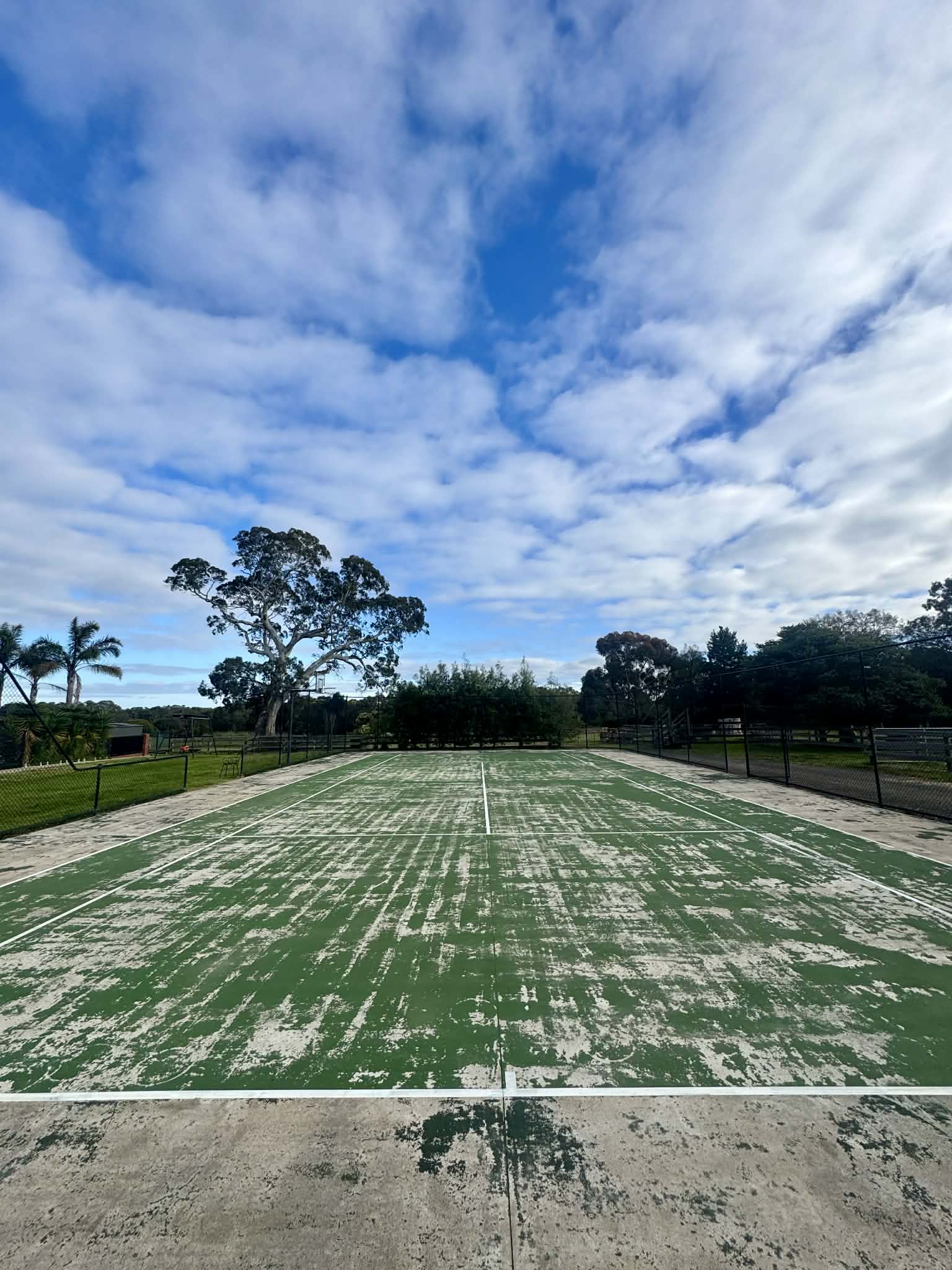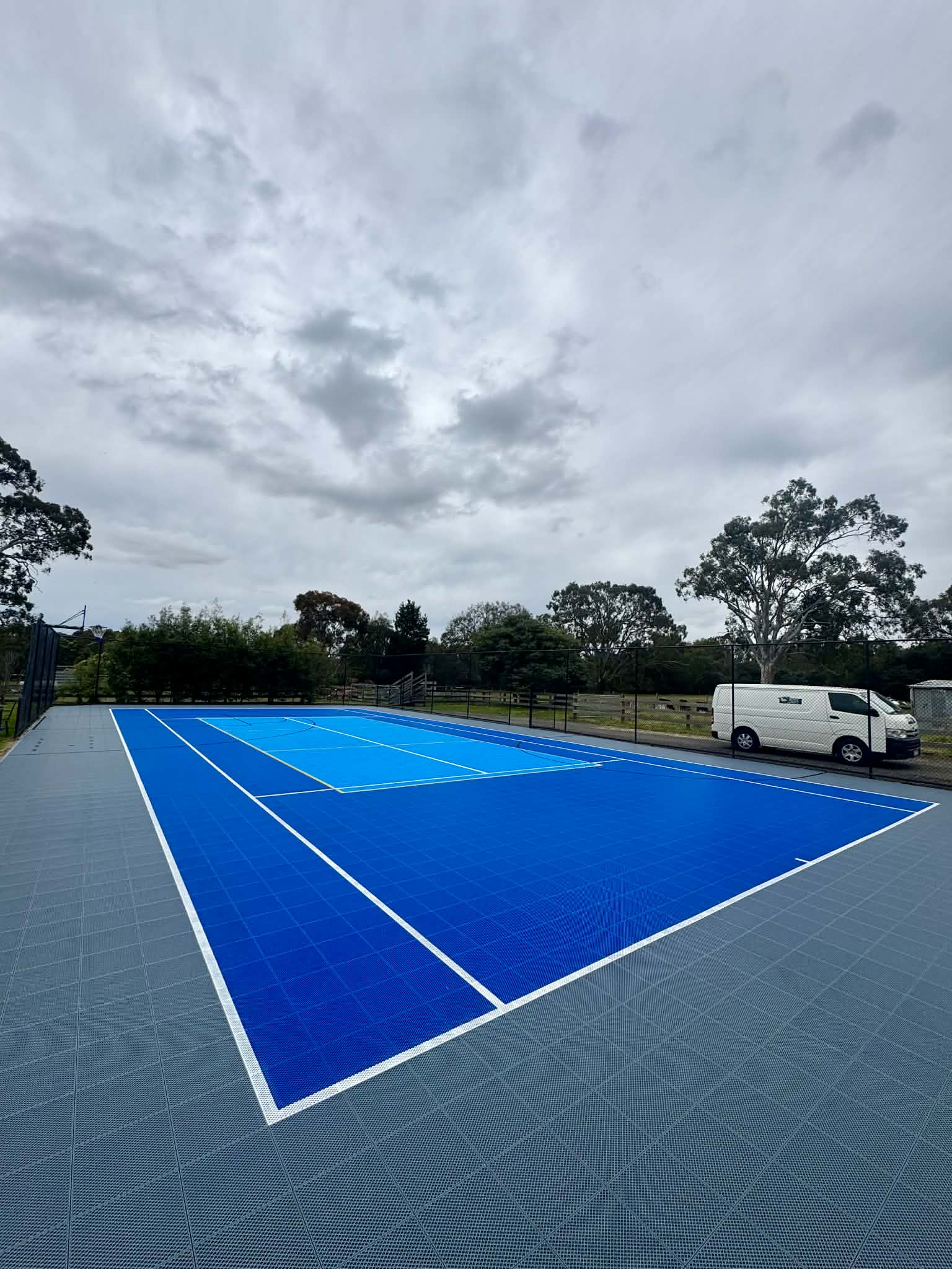 This impressive 15m × 30m court (48ft × 98ft overall) was designed to provide maximum versatility and year round use. At the heart of the surface is a full size 36ft × 78ft tennis court finished in a striking blue with crisp white line markings. The surrounding light grey outer tiles frame the space and help the court integrate cleanly into the rural setting. In the centre of the surface sits a 20ft × 44ft light blue pickleball court with bold yellow line markings for high visibility. On the ends, a basketball key at one end and a netball shooting key at the opposite end, each finished with black line markings for superior clarity.From tired tennis court to multi sport showpiece