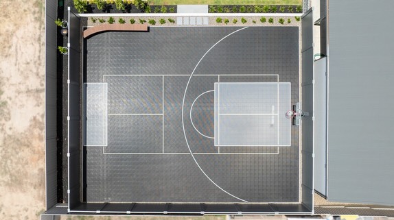 The owners wanted a multi purpose court that offered professional functionality while enhancing the layout of their new property. Working from a simple sketch, Sports Courts Victoria designed and delivered a precision built 13.69m × 16.8m court that blends seamlessly into the surrounding yard, gardens and pool area. The colour scheme is clean and modern with a black performance surface, grey key, white basketball lines, grey soccer goal and white lines and contrasting yellow pickleball markings for clarity and visual accuracy. The result is a multi sports court that is easy to navigate and impressive to look at, whether viewed from ground level or from the home’s elevated vantage points.Slam Man perfection. More than just a court, it’s part of the landscape