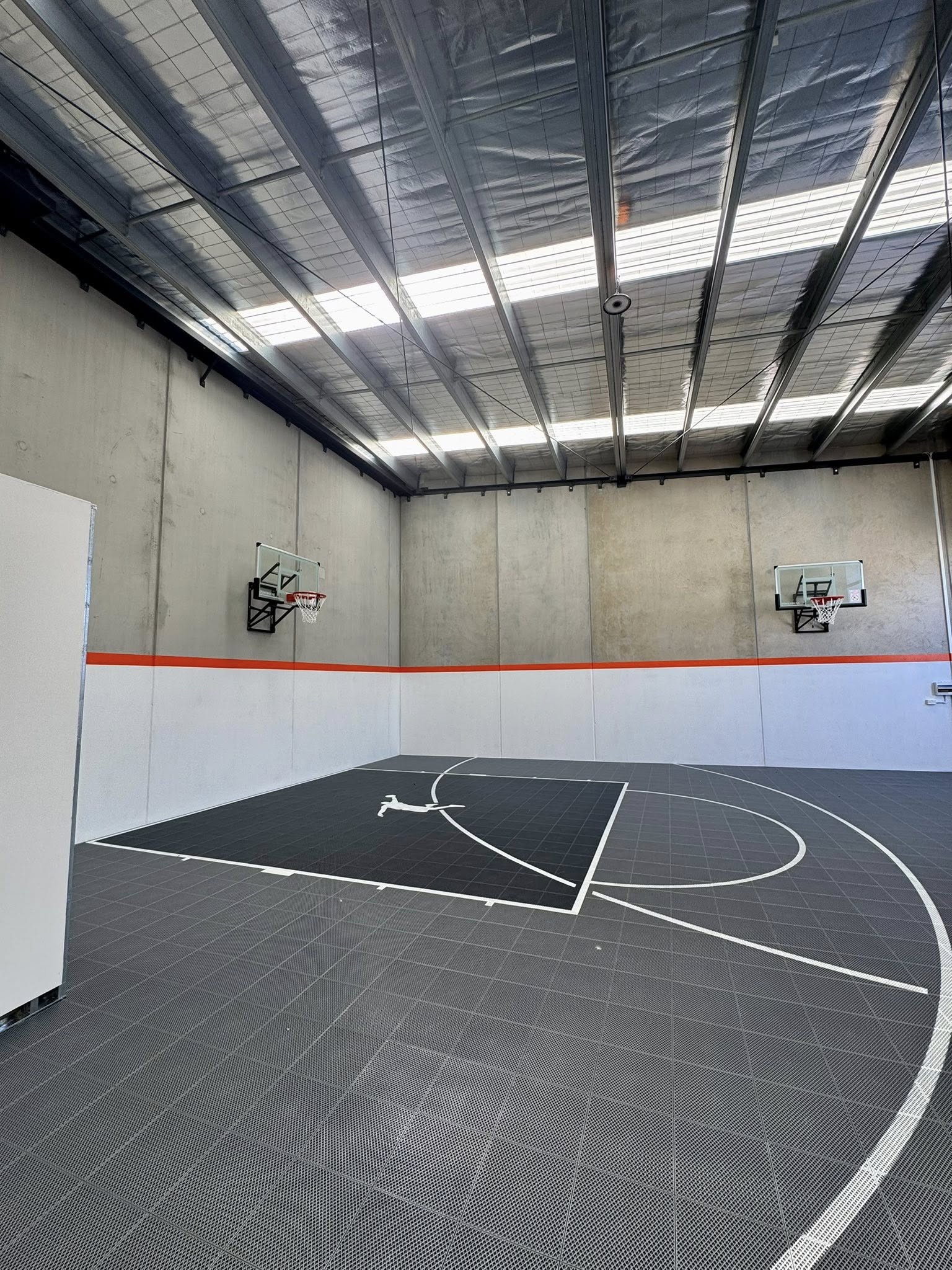 Slam Man “Elite” Custom Basketball Gym – 130m² cut onsite to fit, including Black & Dark Grey tiles with “Glow in the Dark” White Line Marking