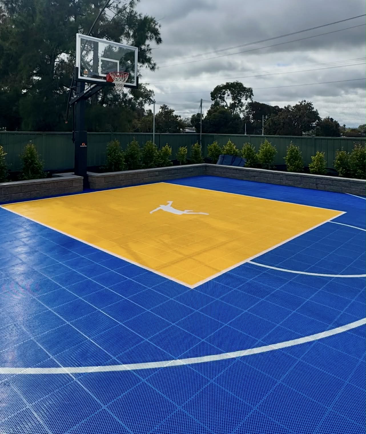 This 9.9m x 7.6m Slam Man Elite basketball court features a bold yellow key paired with a striking blue outer, creating a vibrant and high impact design that stands out from every angle. The colour combination delivers both visual appeal and clear court definition for everyday play.