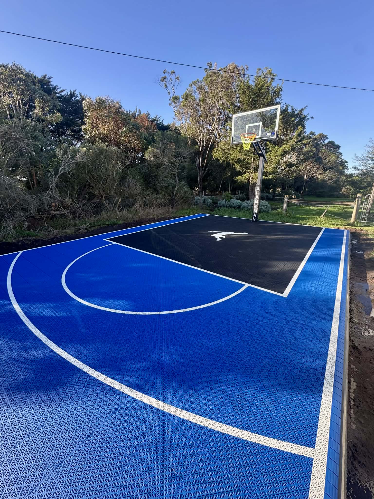 This custom 6.3m x 9.1m Slam Man Pro Cushion basketball court in Geelong delivers the complete backyard basketball package, combining elite performance under foot with a premium inground ring system.